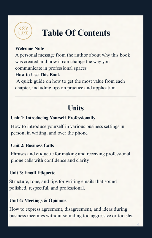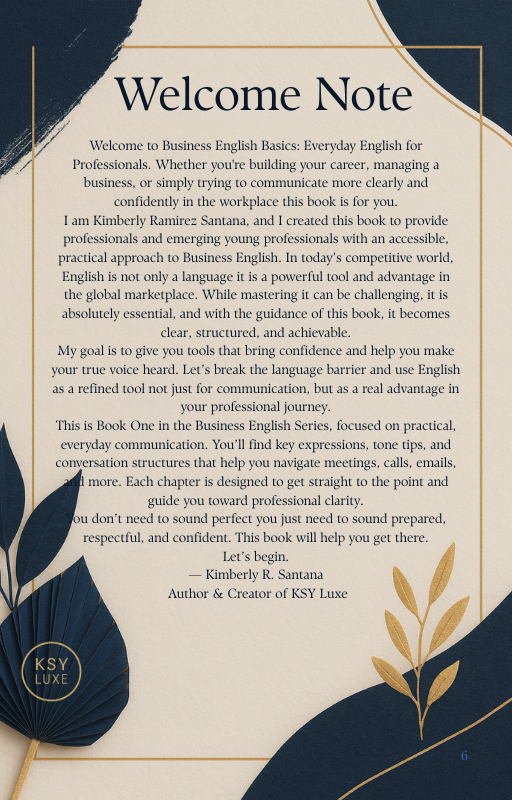 This book takes the stress out of professional English. This book gives you clear, direct tools that make communicating in business feel natural — so you can focus on making an impact, not second-guessing your words.